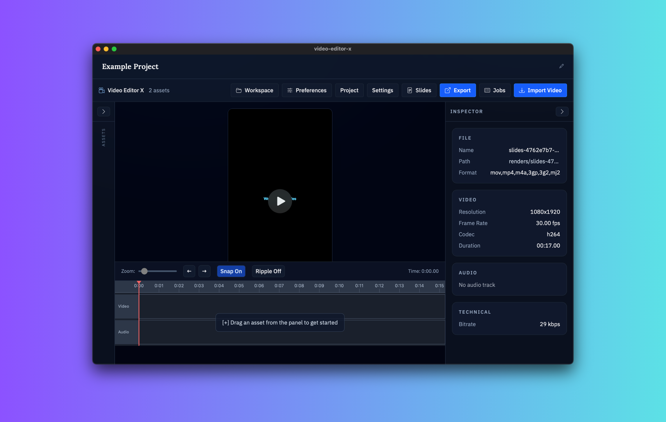 The core problem this project this solves for me is wanting to take advantage of ffmpeg and its powerful set of features. I want a simple editing setup and a way to draw audio visualizations using it with a GUI. I also want to be able to take markdown slides and turn them into simple video with audio voiceover. It takes advantage of browser APIs exposed by WebViews for audio recording, editing and parsing libraries that JS can provide like codemirror, as well as htmltocanvas for markdown to html to png for the backend to put together in a video.