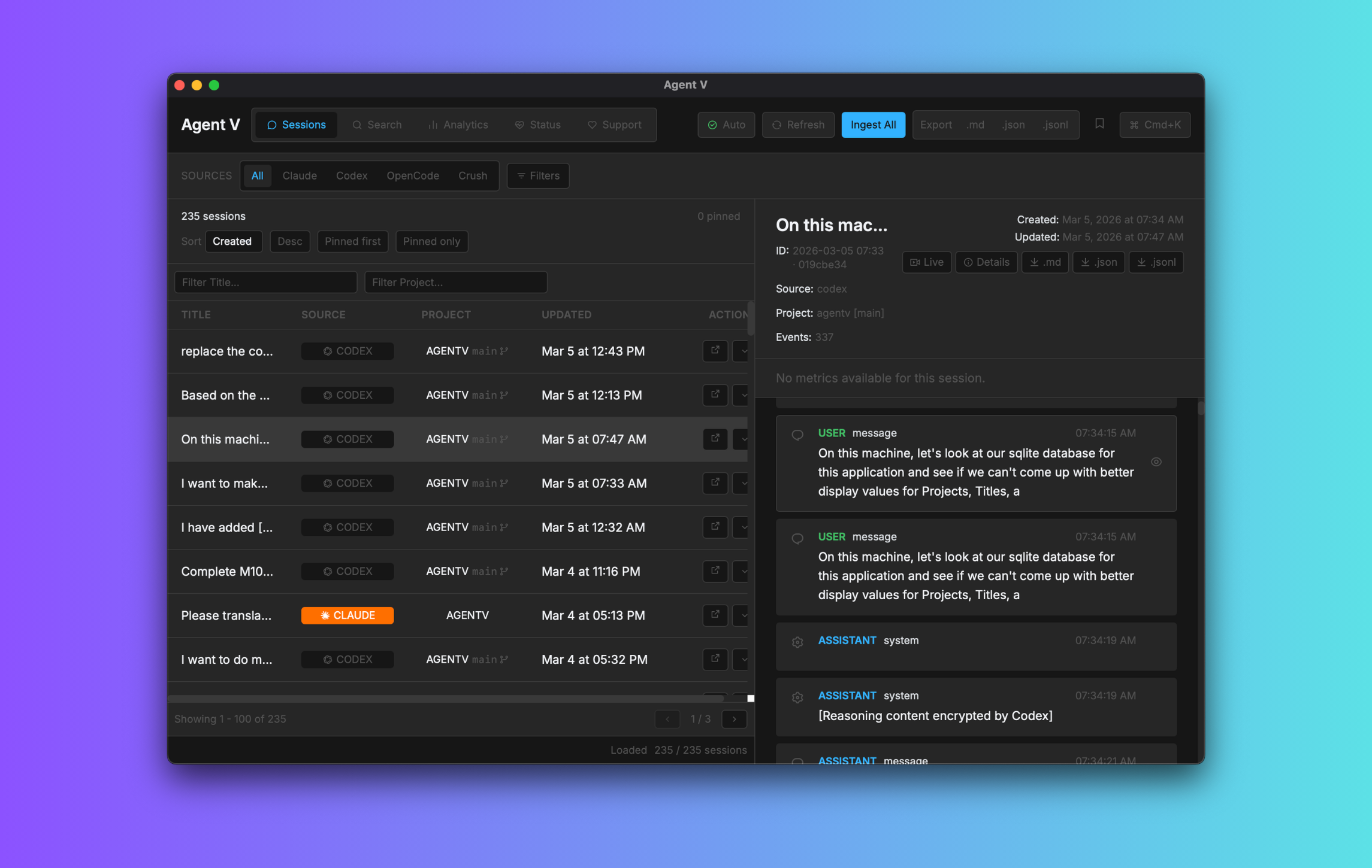 Agent V (v for visualizer) is a CLI and desktop GUI that ingests logs and session data from AI programming agents/assistants and displays them. Right now it supports Codex, Claude, OpenCode, and Crush. It's been interesting to take a peek into how I use agents and the estimated token costs of what I ask them to do. It would be interesting to see how much it costs the companies hosting the models and the carbon footprint of my work.